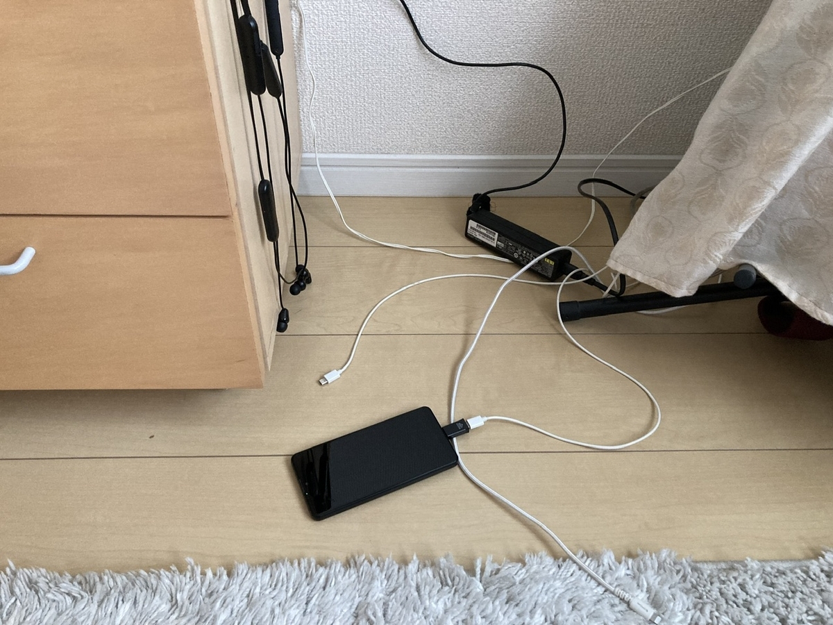 スマホとイヤホンとケーブルが入り乱れ、